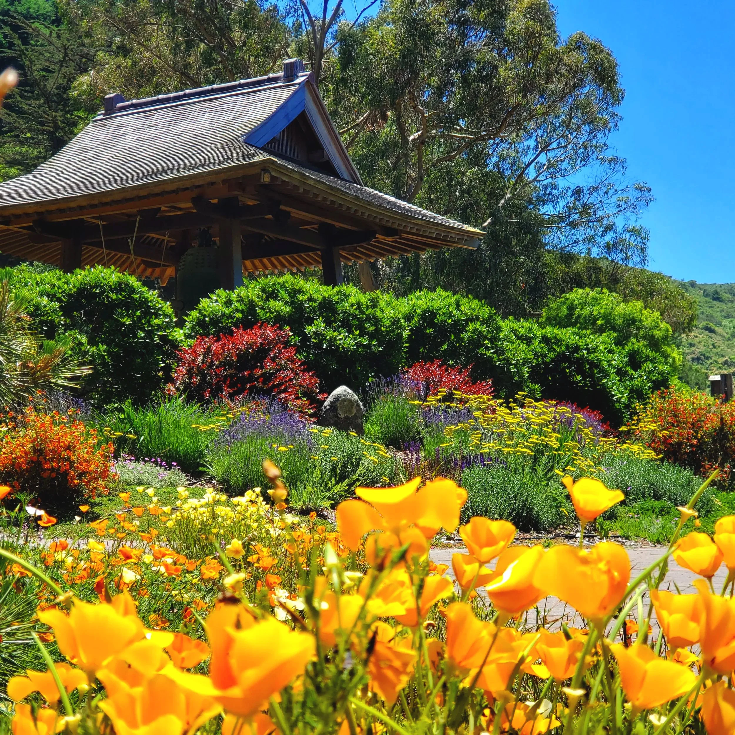 As you arrive at Green Gulch, you are greeted by eucalyptus, redwoods, and Muir Beach, just a short walk from our practice space. Nearby trails lead to Muir Woods to the north, and the Golden Gate National Recreation Area to the south.